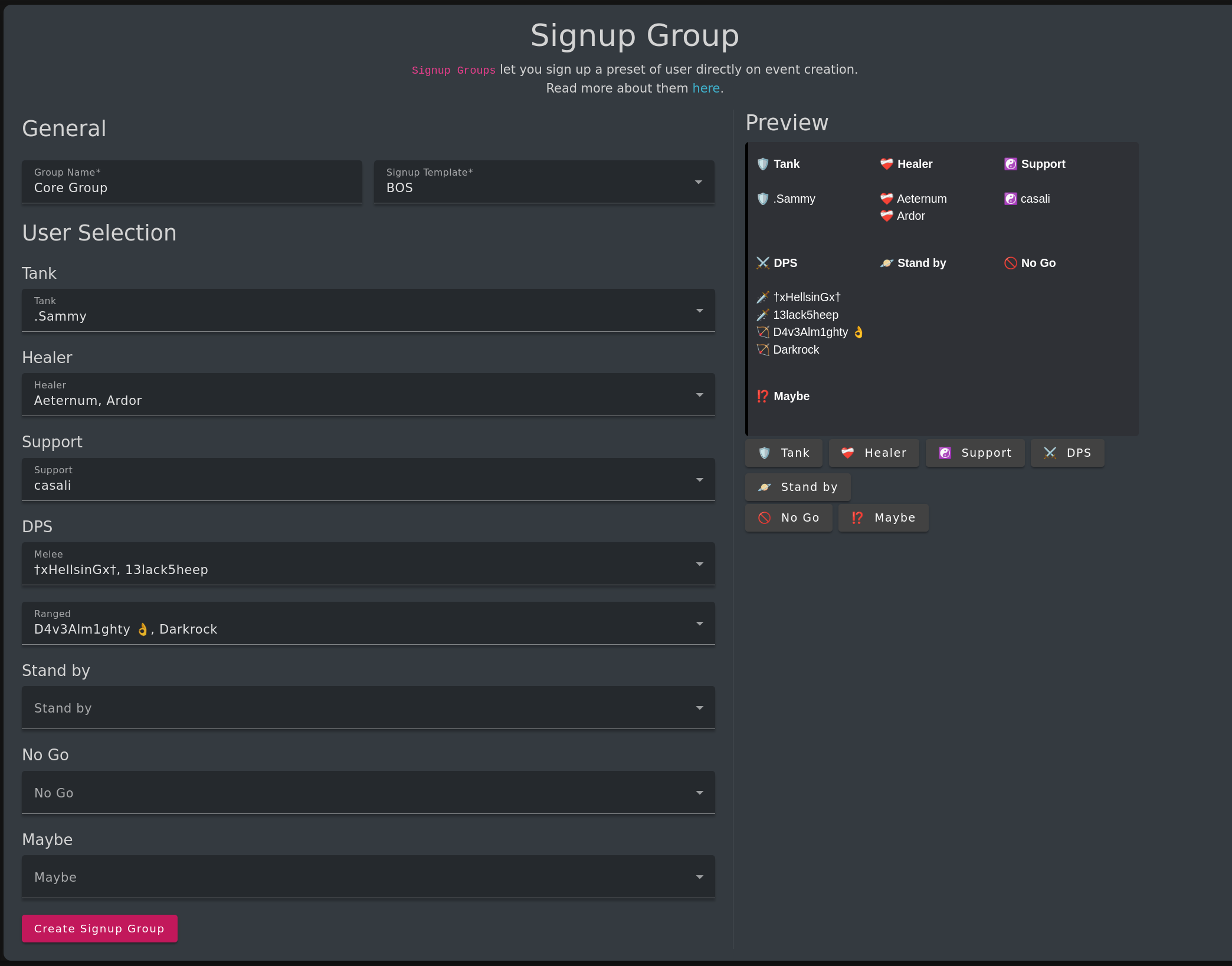 Signup Groups can only be created via the website. To create an entry, go to your guild
